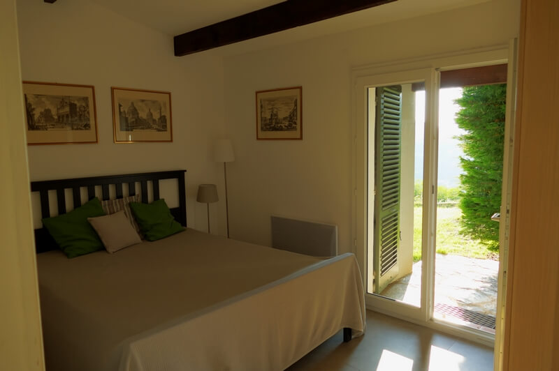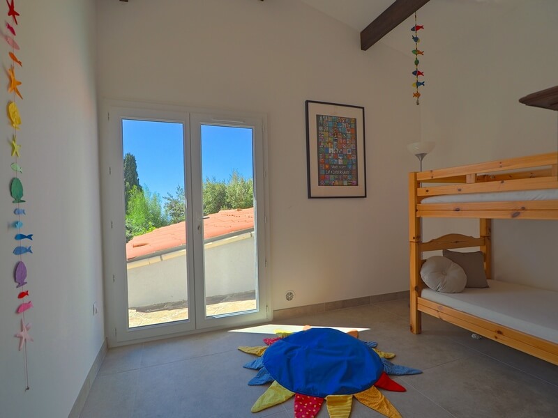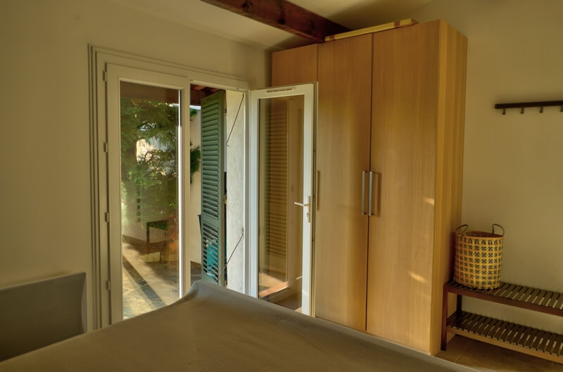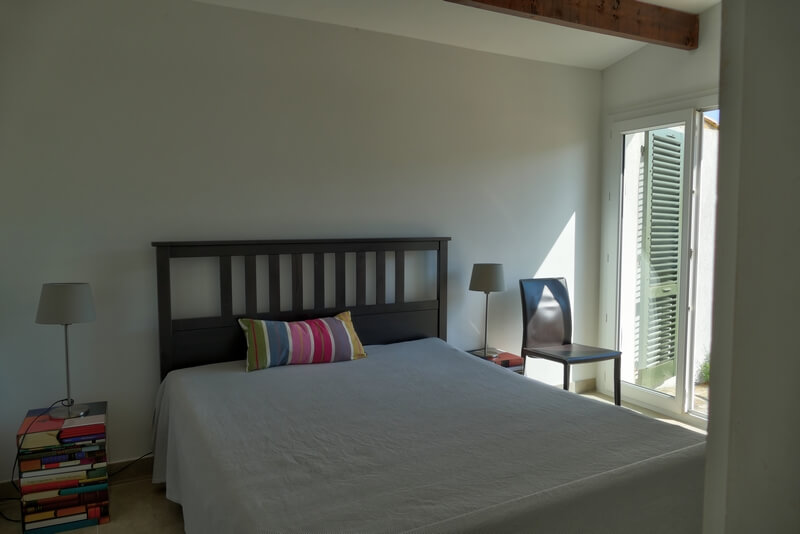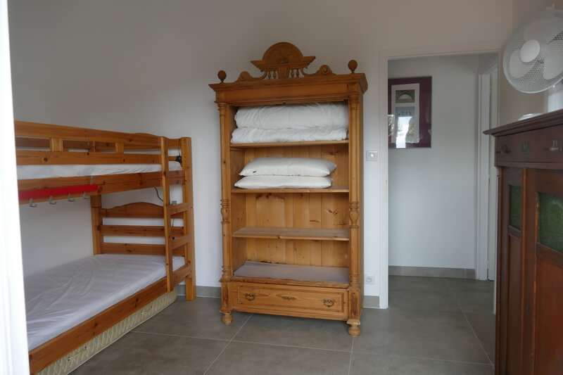 Ein paar Stufen führen durch einen Gang zu den drei Schlafräumen. Zwei Schlafzimmer sind mit Betten in der Größe 1,60 m ausgestattet und in einem Zimmer steht ein Stockbett. Zwei der Schlafräume zeigen nach Süden und haben Meerblick.