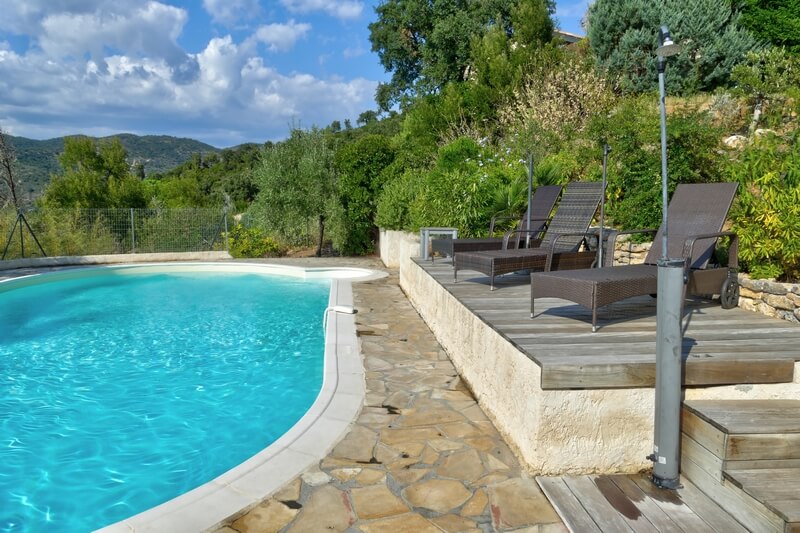 Abkühlung findet man im 12 x 6 m großen Pool, der sich in einem etwas tiefer gelegenen Teil des Gartens befindet.