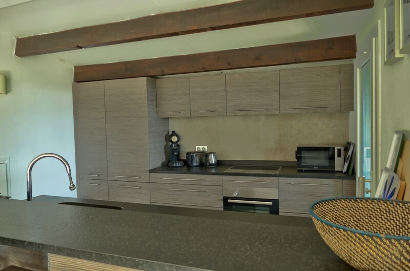 Die Küche (offen mit Bartresen zum Esszimmer) ist komplett neu und hochwertig renoviert. Auch von der Küche haben sie Zugang zu der Terrasse und können während der Küchenarbeiten den Blick auf's Meer genießen. Die Küchenausstattung umfasst: